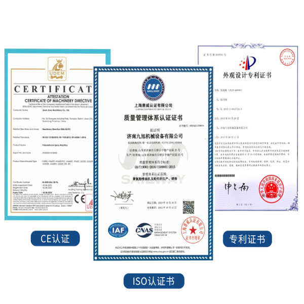 山東九旭機械科技有限公司歷經十幾年的發展,已成長為聚氨酯設備行業頗具實力的設備制造業之一。企業主要產品:聚氨酯高壓噴涂機、聚氨酯發泡機、聚氨酯噴涂機、聚脲設備、聚氨酯發泡設備、聚氨酯發泡機等關于設備配件(聚氨酯高壓噴槍、槍嘴、加熱管道、料塊、摩擦副、增壓泵、混合式、提料泵等)也是堅持最好的質量服務用戶,并承接:外墻保溫、冷庫保溫發泡等工程。山東九旭機械科技有限公司已通過ISO9001:2015質量管理體系認證和國家高新技術企業認證,目前山東九旭機械設備已領跑中國聚氨酯設備行業,成為廣大客戶之首選。